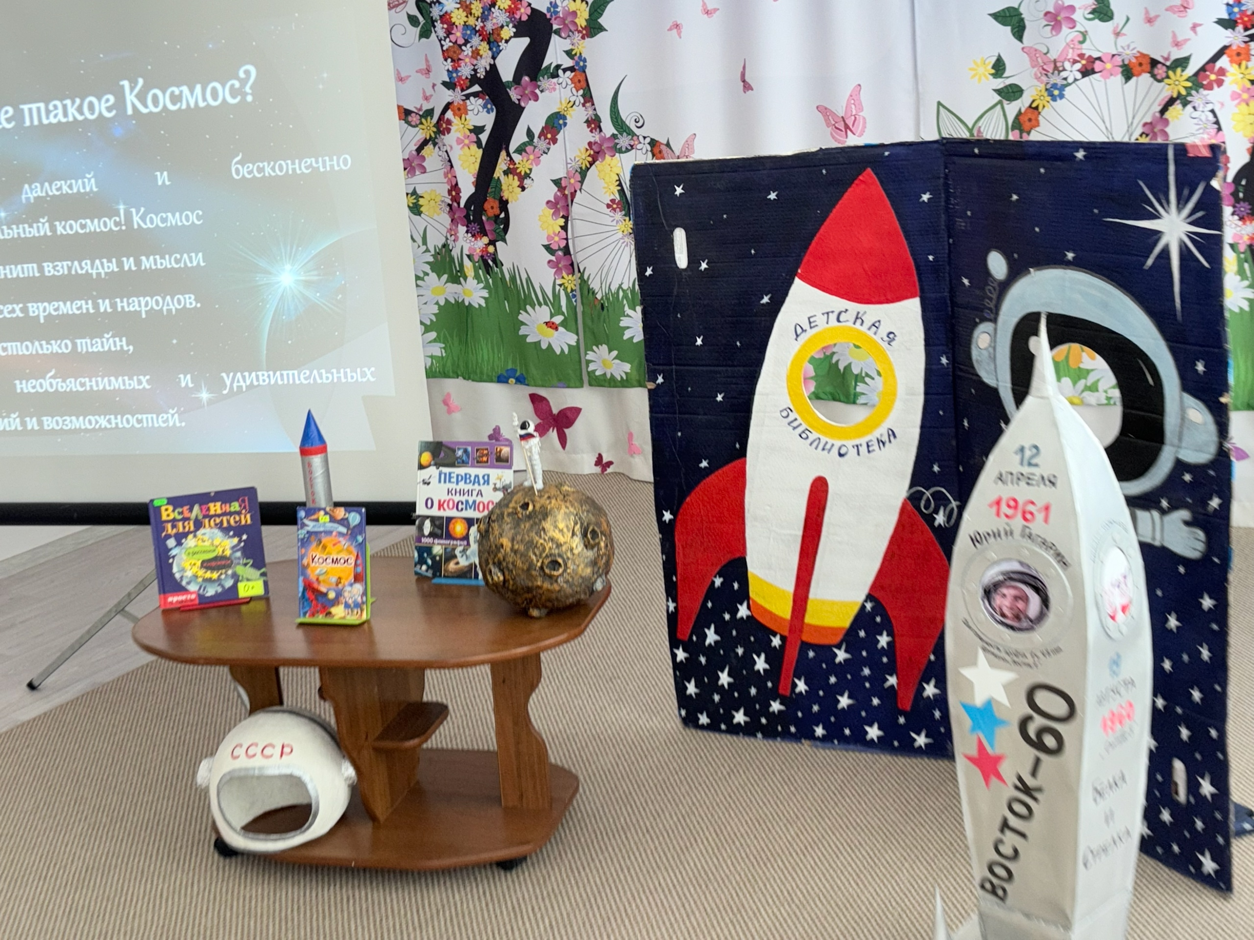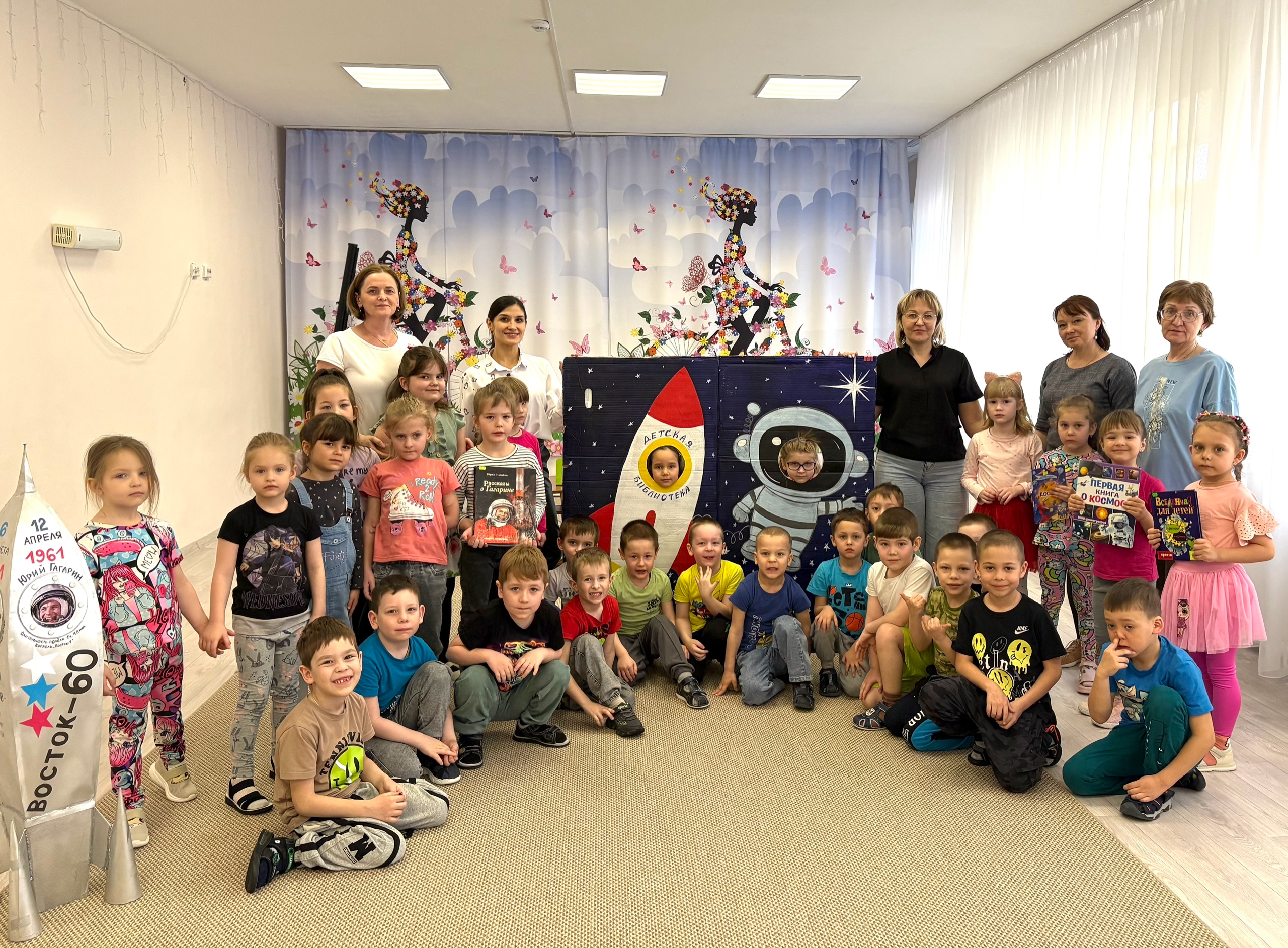 В преддверии праздника — Дня космонавтики, в рамках областной акции «Читаем о Юрии Гагарине», наш детский сад посетила Центральная районная детская библиотека. Тема космоса также необъятна, как само мироздание. Как рассказать ребенку о бесконечности, о строении планет и звездных систем. С чего начать? Библиотекари Щеблютова Наталья Юрьевна и Меркулова Елена Сергеевна не только нашли нужные слова, но и смогли показали ребятам, как все это выглядит. Вниманию ребят была представлена интереснейшая презентация о космосе, книги для детей о космонавтах, а также была организована мини выставка с «космическими» экспонатами. Внимательно посмотрев и послушав важную и интересную информацию, воспитанники отвечали на вопросы и задавали свои! А еще ребята смогли сами побывать немного космонавтами, примерить на себя скафандр, увидеть метеорит и потрогать ракету. Наталья Юрьевна и Елена Сергеевна организовали фото зону, где детки с удовольствием по фотографировались. Получилась очень познавательная и интересная встреч.
